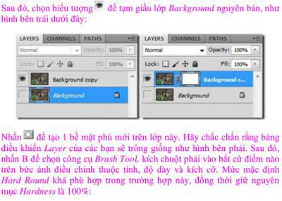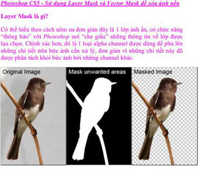 Khi ban muốn che những chỗ không cần thiết trên layer mà không muốn làm ảnh hưởng đến layer đó thì bạn dùng layer mask. Bạn hãy tưởng tượng layer của bạn là một tấm ảnh.Sau đó,bạn dùng một tấm bìa trong suốt đặt chồng lên bức hình đó.Tấm bìa đó chính là layer mask. Bạn dùng Brush Tool tô đen lên layer mask giống như bạn dùng bút lông đen tô lên tấm bìa trong suốt để che đi những điểm không cần ở bức hình nằm dưới. Như vậy tấm hình sẽ được che mà không hề làm thay đổi bản thân tấm hình.